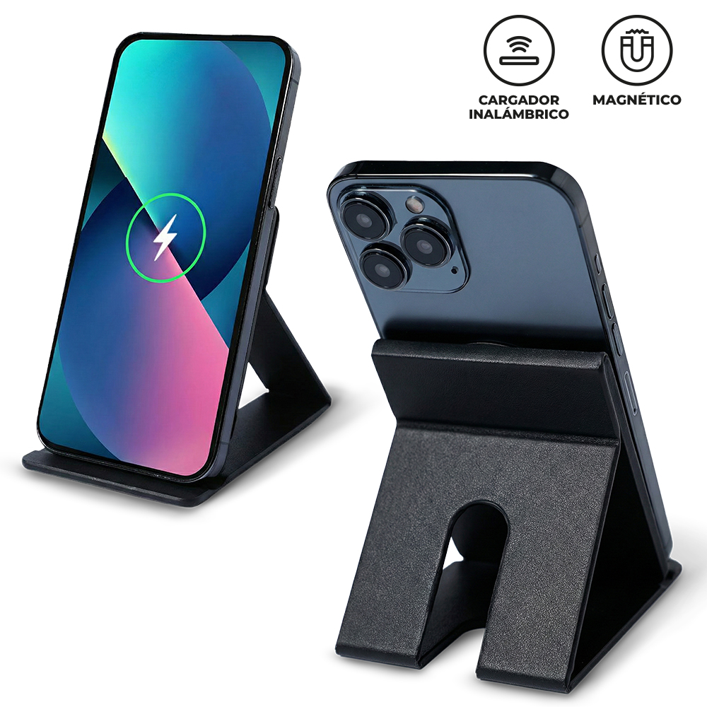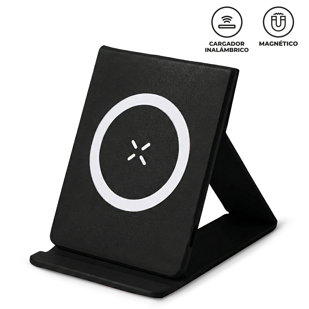 Cargador inalámbrico plegable en poliuretano de 15W. Incluye cable Tipo C para carga y anillo metálico adhesivo. Empaque Caja Individual. Medidas Cerrado: 10.6 cm x 7 cm x 1.2 cm.Marca: 4 cm / Screen / Tampografía, producto con tratamiento.