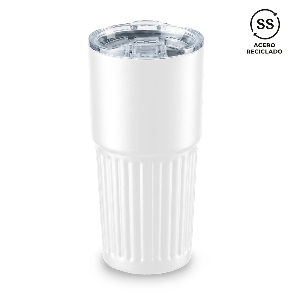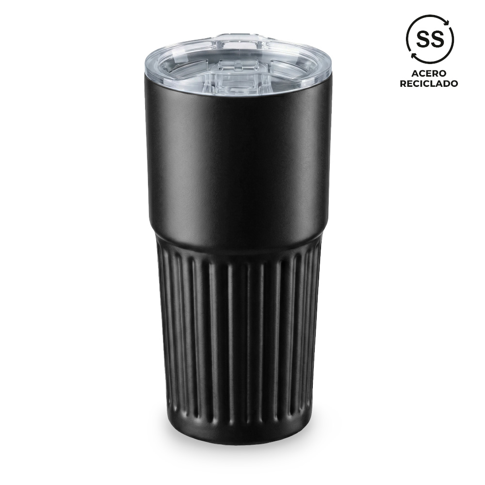 Mug metálico doble pared en acero inoxidable reciclado.La tapa es una tapa protectora de cierre a presión, no es tapa de seguridad. Empaque caja individual.Medidas: 18.4 cm x 9.3 cm diámetro.Marca: 4 cm / Tampografía con Tratamiento / Láser.