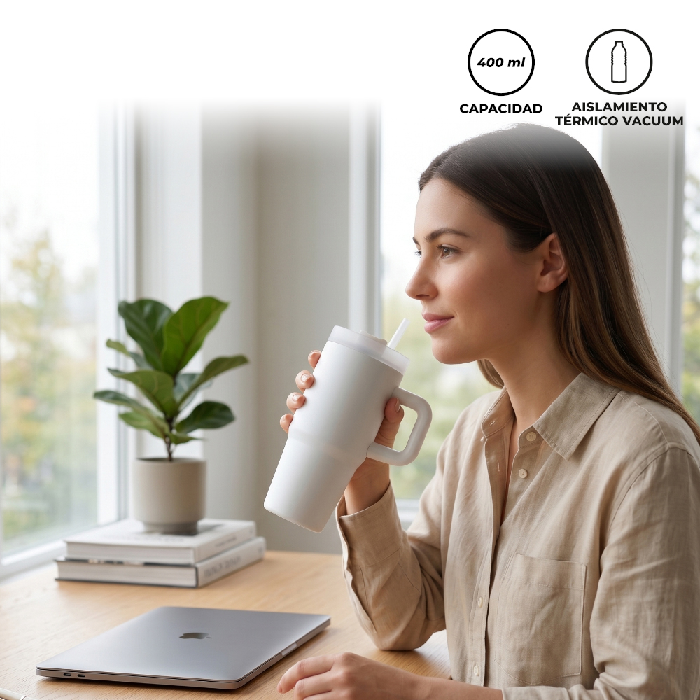 Mug metálico vacuum en acero inoxidable, con aislamiento térmico que mantiene la bebida fría o caliente hasta 6h, aprox (puede variar dependiendo condiciones climáticas).Tapa rosca. Incluye pitillo plástico. Empaque caja individual.Medidas: 18 cm x 6 cm diámetro.Marca: 5 cm / Tampografía / Láser.Medidas: 24.5 cm x 7 cm de díametro.Marca: 4 cm / Tampografía con tratamiento / Láser.