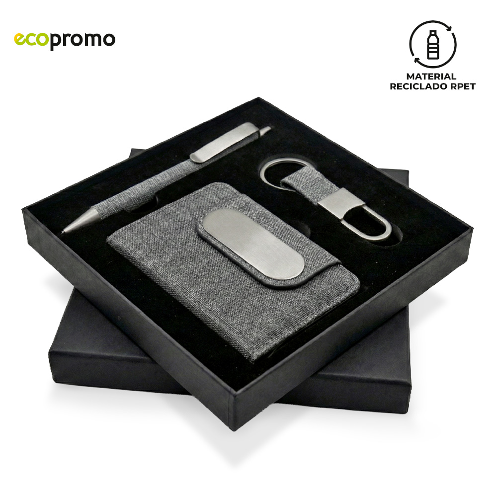 Set de bolígrafo metálico recubierto en tela reciclada RPET, tarjetero metálico recubierto en tela reciclada RPET y llavero reciclado RPET. Empaque caja individual.Medidas caja: 16.4 cm x 16.4 cm x 2.5 cm.Marca: Bolígrafo: 2 cm / Llavero: 1 cm / Portatarjetas: 3 cm / Láser.