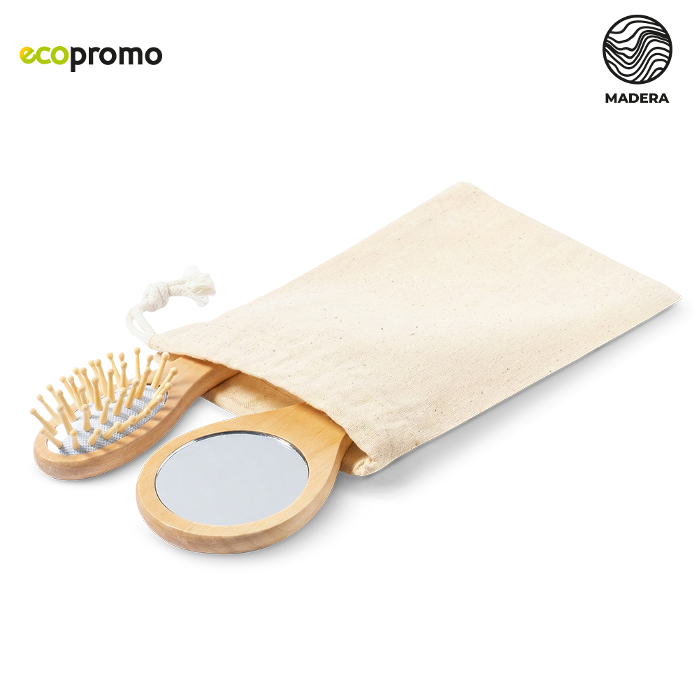 Set de espejo y cepillo en madera natural. Con bolsa en algodón. Artículo para uso personal, no se admiten Cambios/devoluciones. Empaque bolsa individualMedidas Bolsa: 18 cm x 12 cm. Marca: Bolsa: 5 cm / Screen / Cepillo - Espejo: 4 cm / Láser.