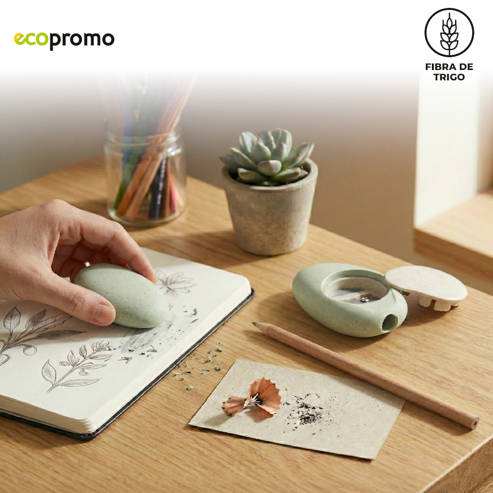 Tajalápiz en fibra de trigo con borrador. Mezcla con material ecológico en fibra de trigo (50%-60% aprox). El porcentaje de material ecológico tiene un promedio de biodegradabilidad de 2-3 años después del fin de su vida útil.Medidas: 6 cm x 4 cm x 2 cm.Marca: 1.5 cm / Tampografía.
