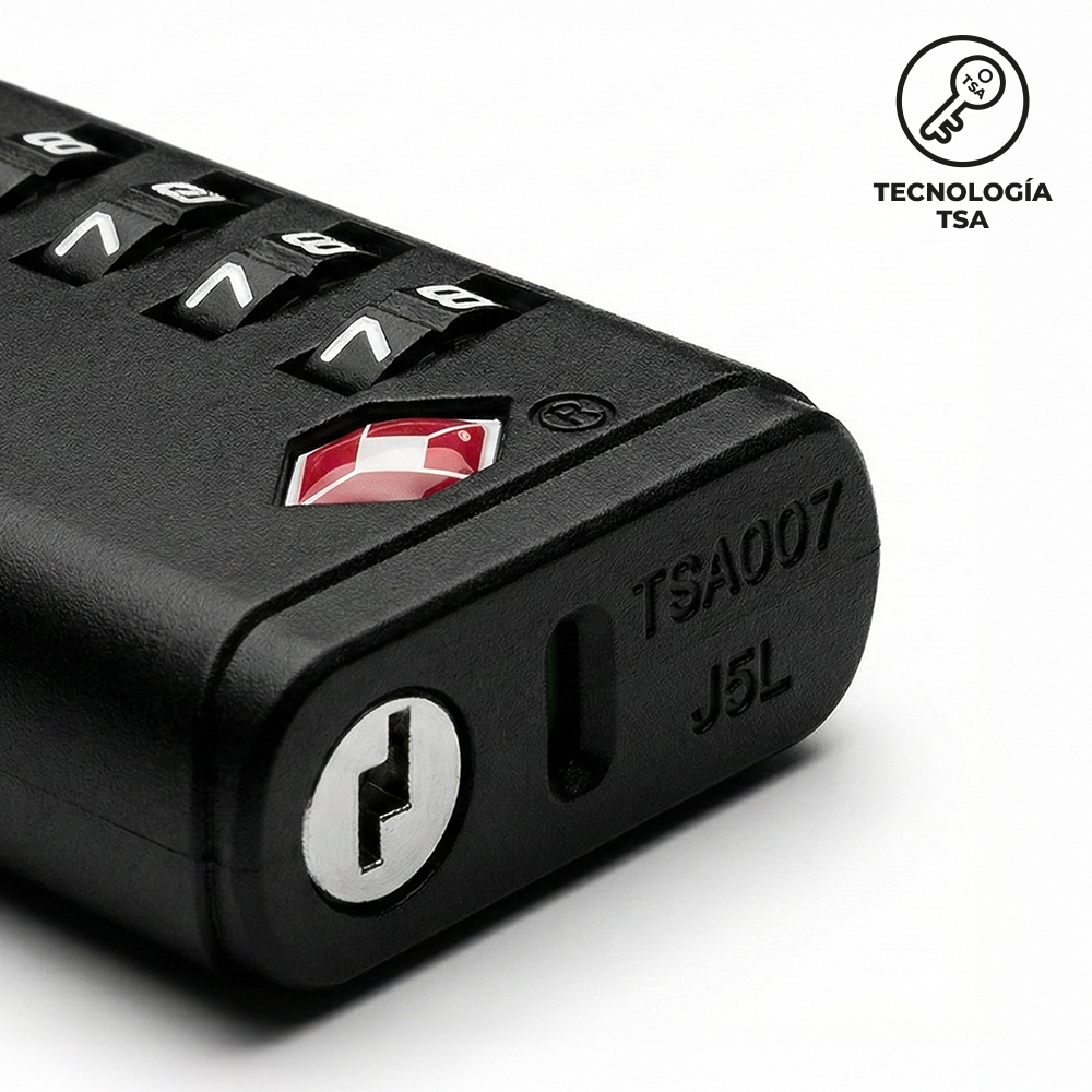 Candado en material ABS con clave de cuatro dígitos. Empaque Caja Individual. NOTA: La tecnología TSA permite que el candado sea abierto con una llave maestra sin ningún daño.Medidas: 6.3 cm x 3.1 cm x 1.5 cm.Marca: 1.2 cm x 1.5 cm / TampografíaFicha Tecnica
