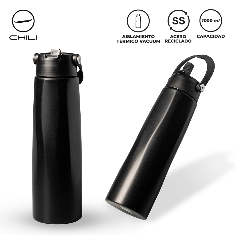 Botilito doble pared vacuum en aceroinoxidable reciclado, con aislamiento térmicoque mantiene la bebida fría entre 8-10haprox o caliente 3-4h aprox (puede variardependiendo las condiciones climáticas).Tapa rosca plástica con pitillo y manija plástica.Estuche caja individual.Medidas: 29 cm x 8.5 cm diámetro.Marca: 4 cm / Láser.