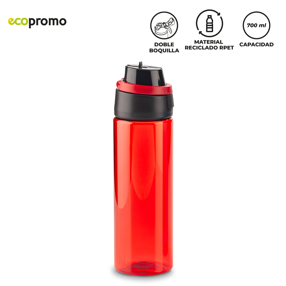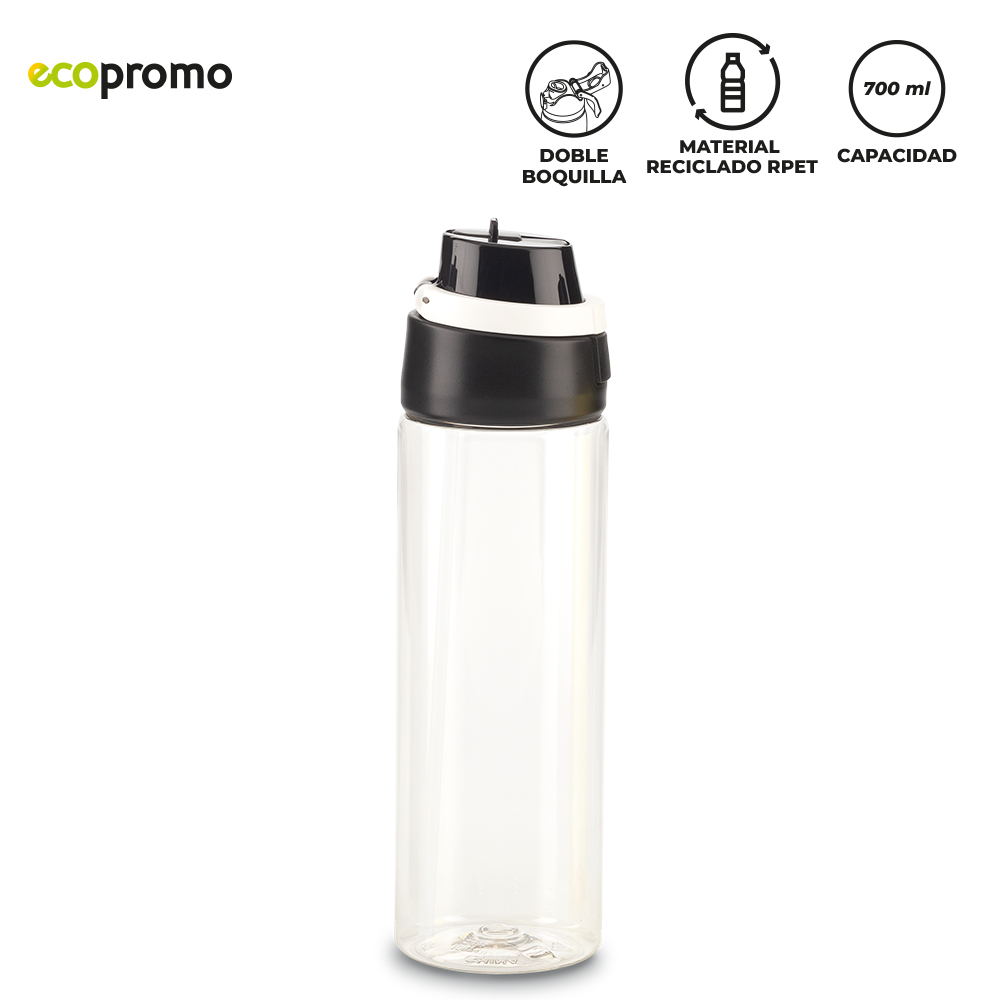 Botilito en plástico reciclado RPET.Con tapa de dos usos: una de pitillo y otra de boquilla.Manija para cargarlo.Medidas: 25 cm x 7 cm diámetro.Marca: 5 cm / Tampografía.