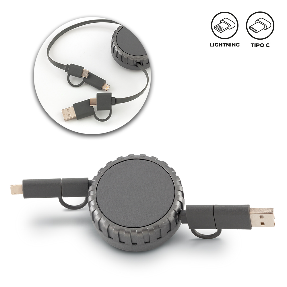 Cable multicargador plástico con poliuretano retráctil. Con doble conexión Tipo USB y Tipo Lightning. Incluye adaptadores Tipo C. Medidas: 5 cm x 2 cm. Marca: 2.5 cm / Tampografía.