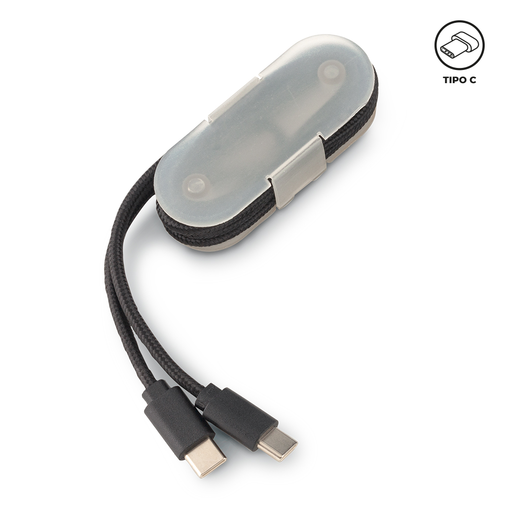 Cable cargador Tipo C de 1 metro. Medidas: 6.5 cm x 2.5 cm x 1.5 cm. Marca: 2 cm / Tampografía.