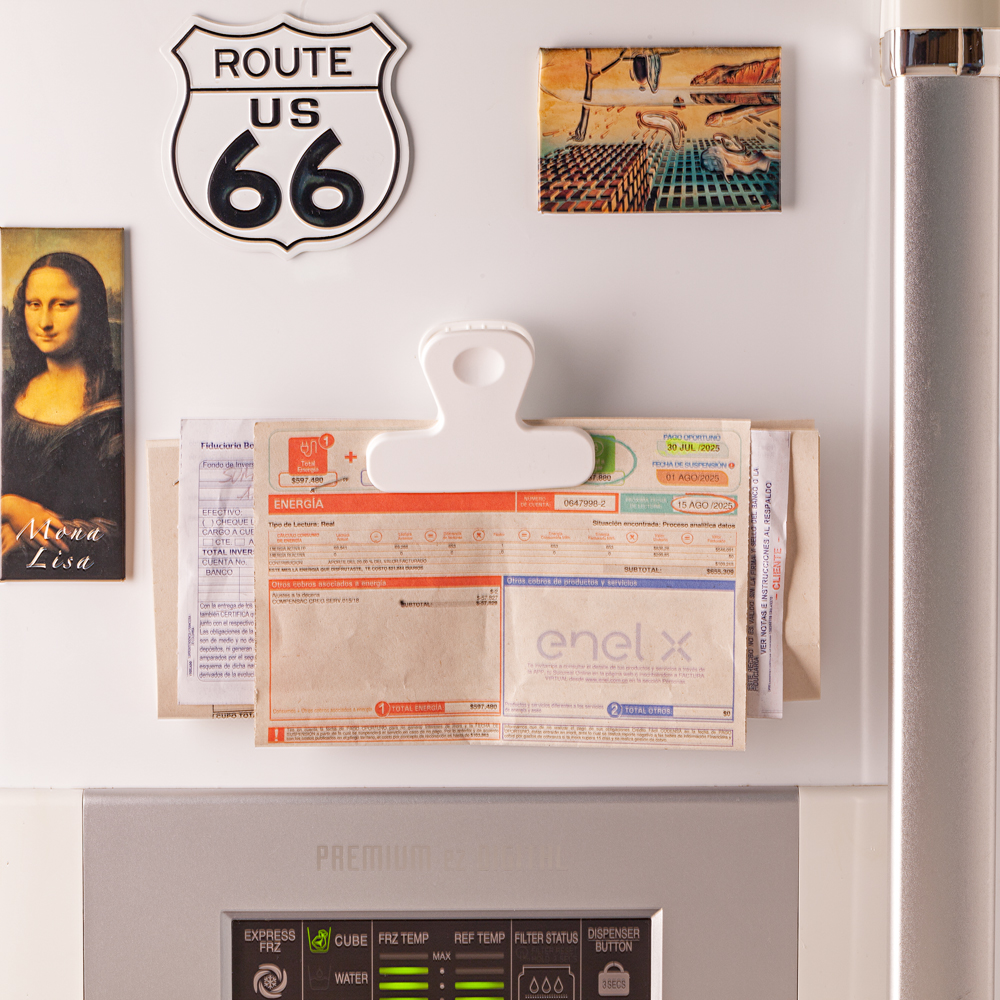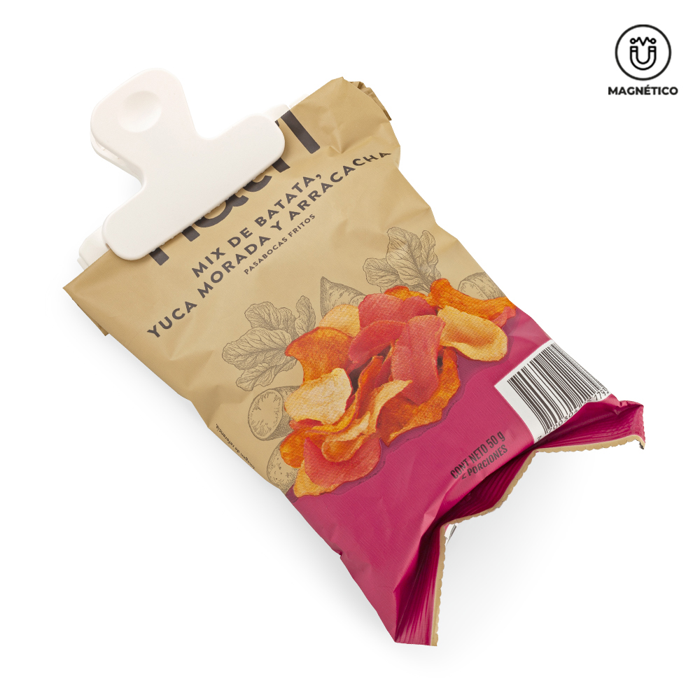 Clip plástico de doble función con imán.Una función portanotas y otra función de clip para cierre de paquetes.Diseño y patente de TaiwánMedidas: 9 cm x 5.5 cm 2 cm.Marca: 3 cm / Tampografía.
