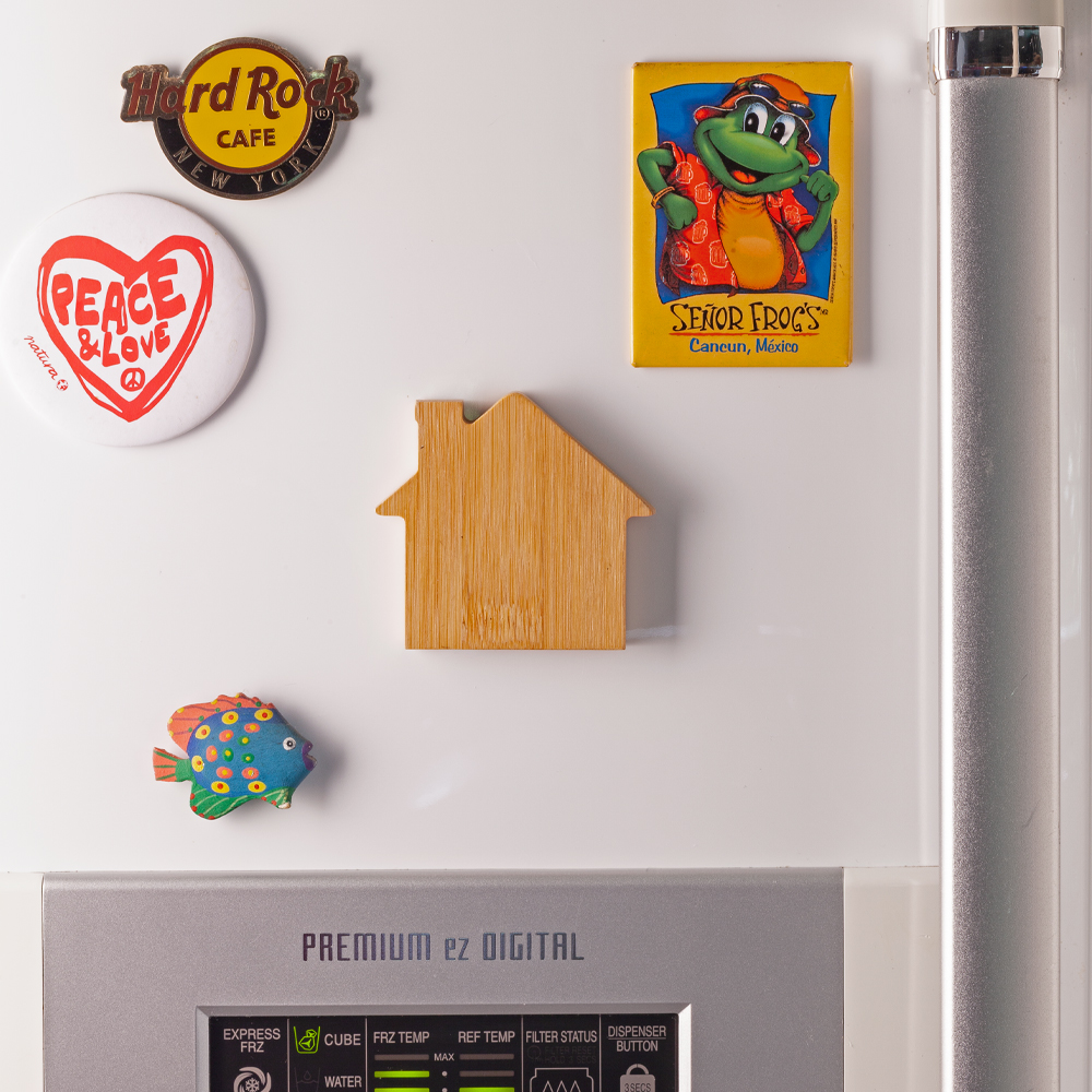 Destapador en bambú con imán.Medidas: 8 cm x 7.5 cm x 1 cm.Marca: 3 cm / Tampografía / Láser.