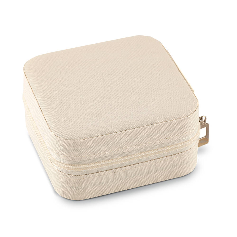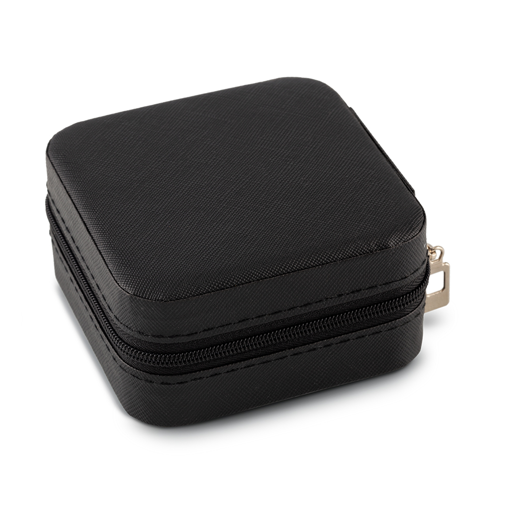 Joyero en imitación cuero con cremallera. La parte superior interna tiene 3 ganchos y un bolsillo elástico.La parte inferior interna tiene 4 compartimientos y 6 espacios para anillos. Empaque caja individual.Medidas: 9.5 cm x 9.5 cm x 5 cm.Marca: 4 cm / Tampografía.Ficha Técnica
