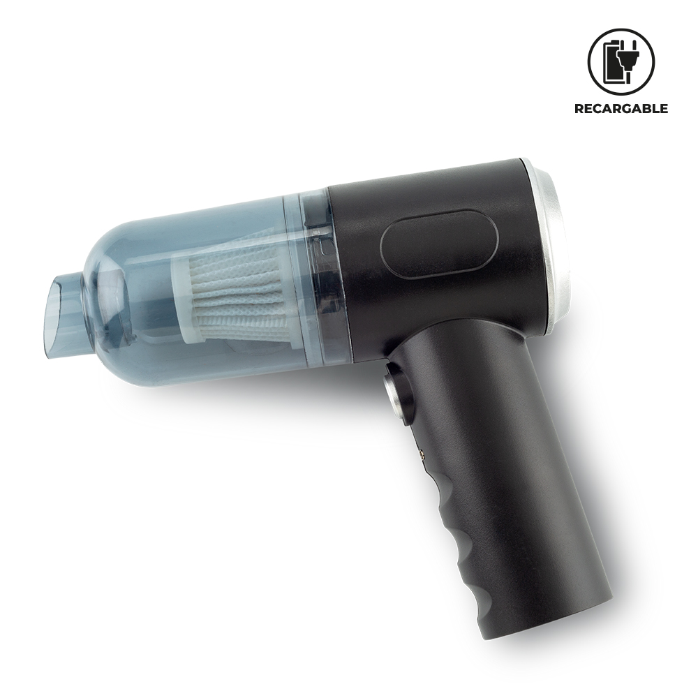 Mini aspiradora portátil 3 en 1. Incluye 3 accesorios. Funciona para limpiar teclados, objetos pequeños y carro. Recargable. Empaque caja individual.Medidas caja: 16 cm x 13 cm x 6 cm. Marca: 2.5 cm / Tampografía.