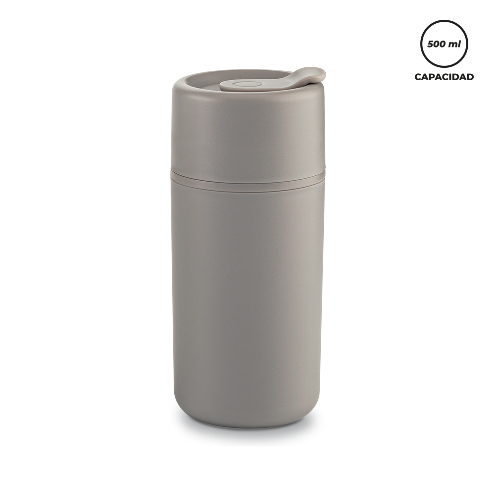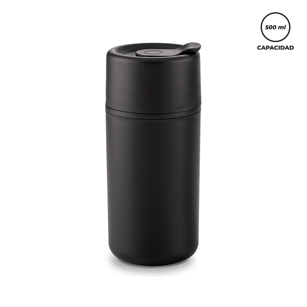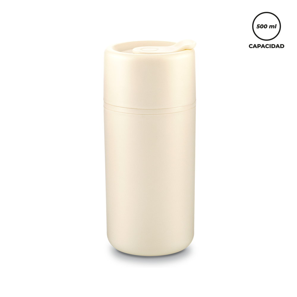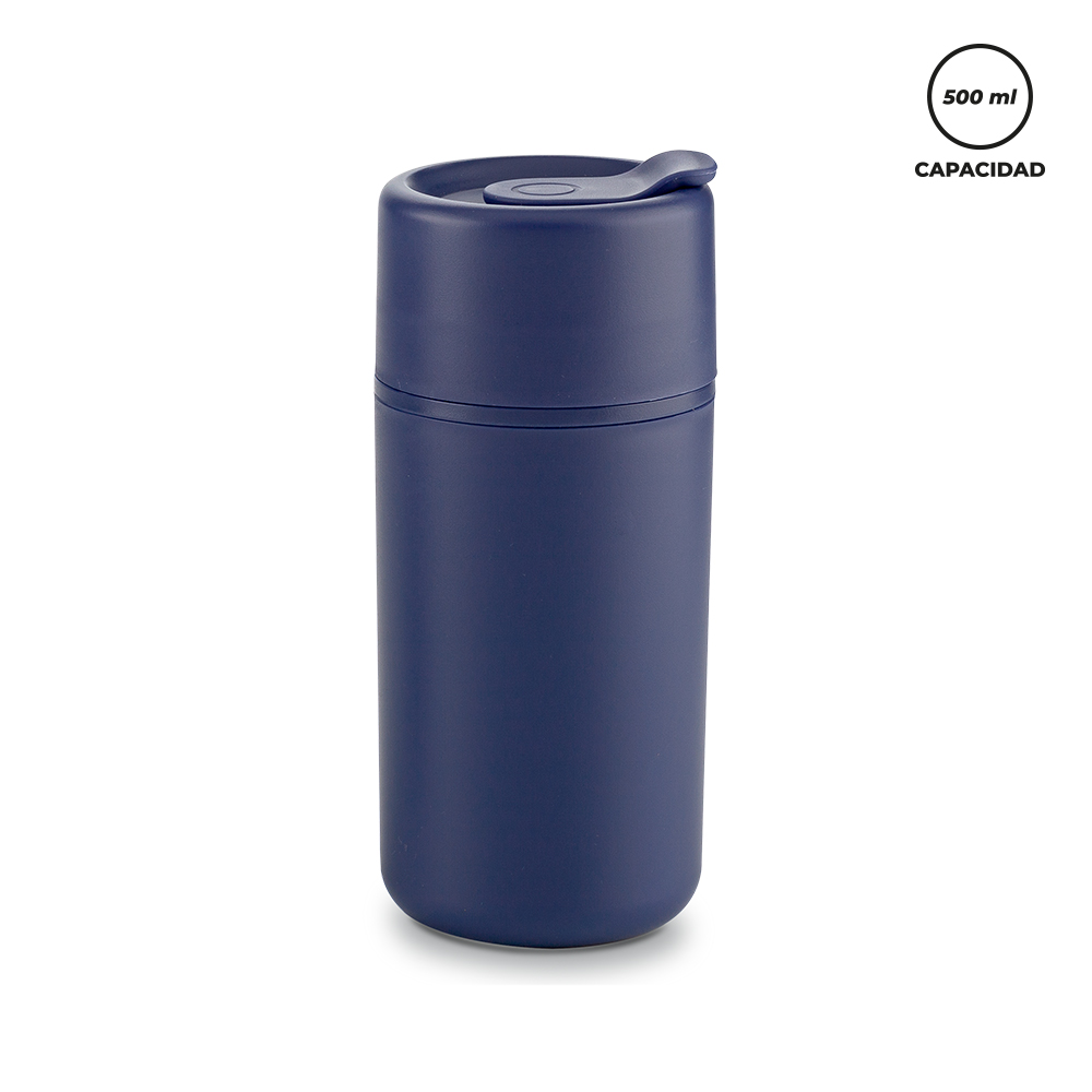 Mug plástico doble pared. Con tapa rosca.Medidas: 17.5 x 7 cm.Marca: 5 cm / Tampografía.