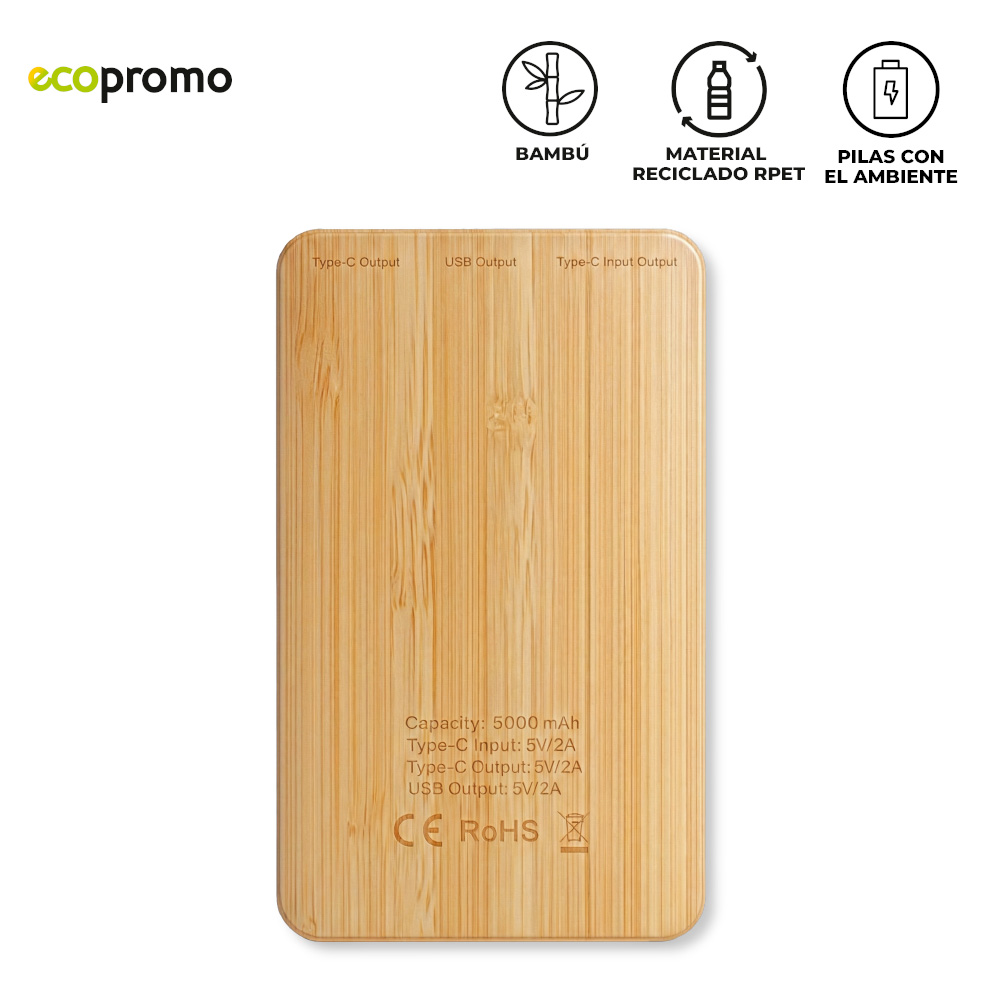 Pila recargable en bambú y poliéster reciclado RPET de 5000 mAh. Incluye cable tipo C para carga.Medidas: 9.5 cm x 6.2 cm x 1.6 cm.Marca: 5 cm / Tampografía / Láser.