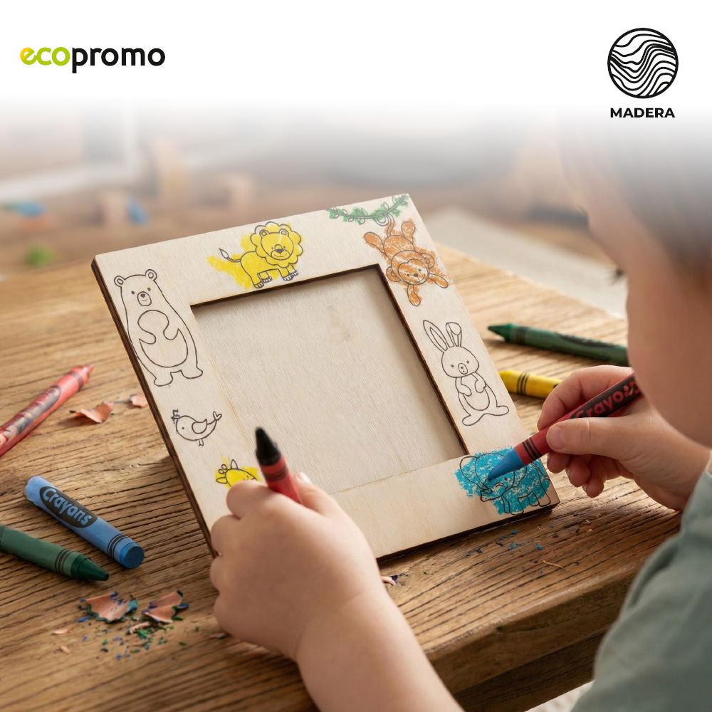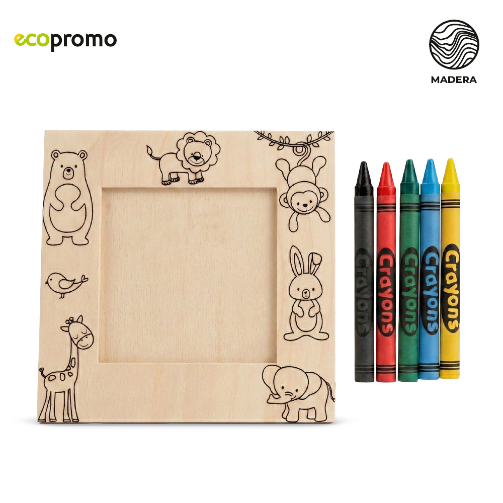 Portarretrato en madera natural con diseños de animales. Incluye crayolas de colores para poder decorar el marco.Medidas: 11.3 cm x 11.3 cm.Marca: 5 cm / Tampografía / Láser.
