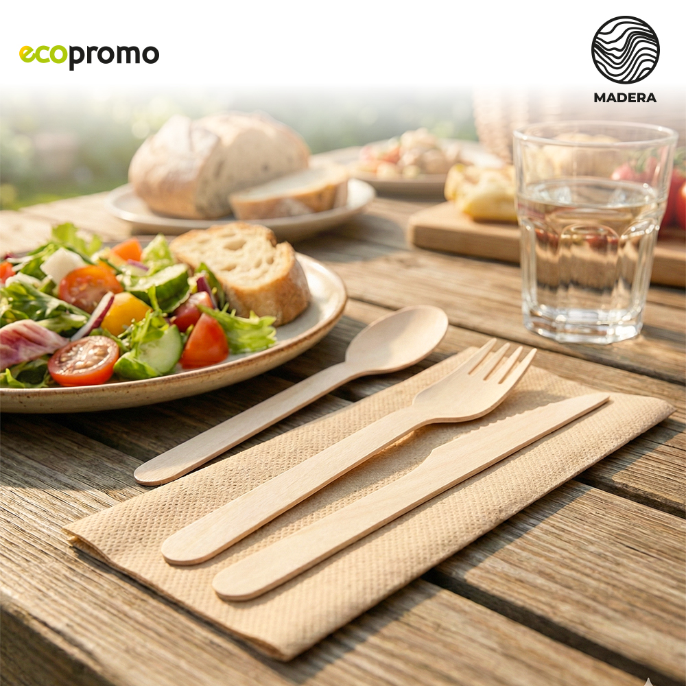 Juego de cubiertos elaborados en madera natural (Cuchara, Cuchillo y Tenedor) y servilleta de papel. En bolsa sellada por higiene tipo Kraft. Artículo para uso personal, no se admiten Cambios/devoluciones.Medidas: 21 cm x 5 cm.Marca: 2 cm / Tampografía en la bolsa.