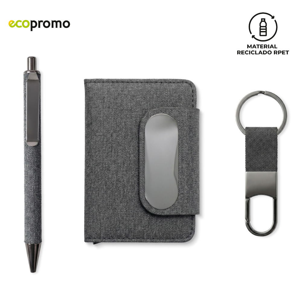 Set de bolígrafo metálico recubierto en tela reciclada RPET, tarjetero metálico recubierto en tela reciclada RPET y llavero reciclado RPET. Empaque caja individual.Medidas caja: 16.4 cm x 16.4 cm x 2.5 cm.Marca: Bolígrafo: 2 cm / Llavero: 1 cm / Portatarjetas: 3 cm / Láser.