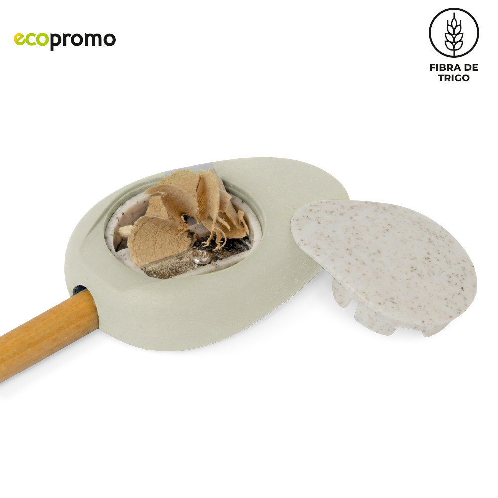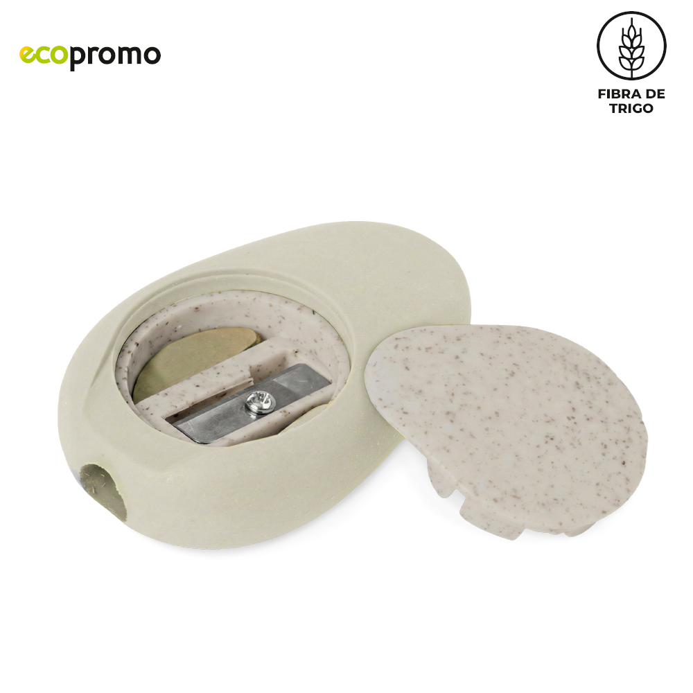 Tajalápiz en fibra de trigo con borrador. Mezcla con material ecológico en fibra de trigo (50%-60% aprox). El porcentaje de material ecológico tiene un promedio de biodegradabilidad de 2-3 años después del fin de su vida útil.Medidas: 6 cm x 4 cm x 2 cm.Marca: 1.5 cm / Tampografía.